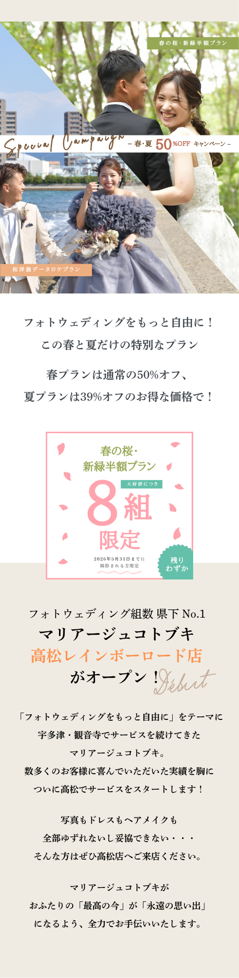 春はフォトウェディングのベストシーズン!桜はもちろん、若葉がまぶしい新緑の中で映える2人の衣装姿も美しい!3月末までのご成約で、このベストシーズンで撮影するフォトウェディングがとってもお得に叶います。